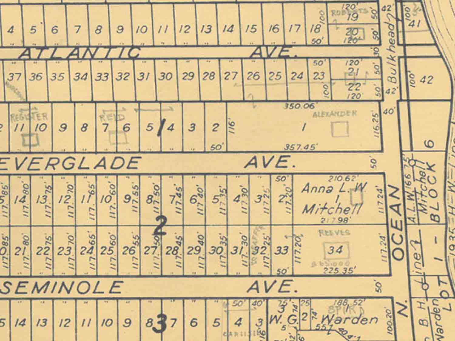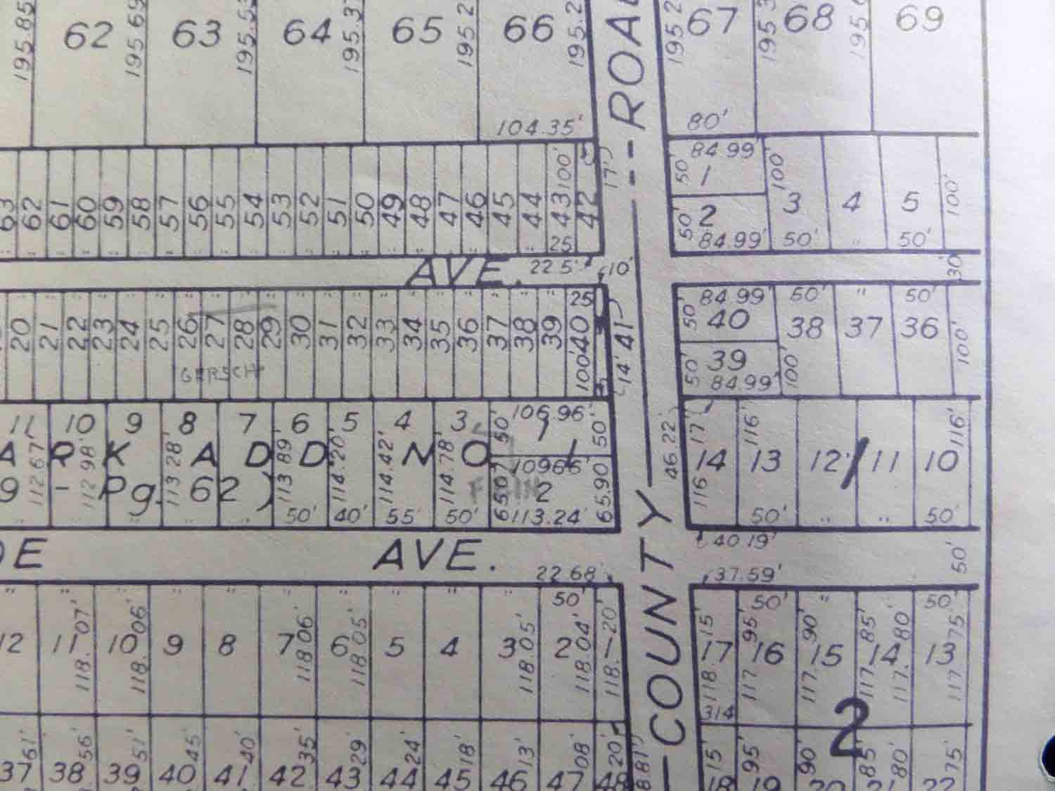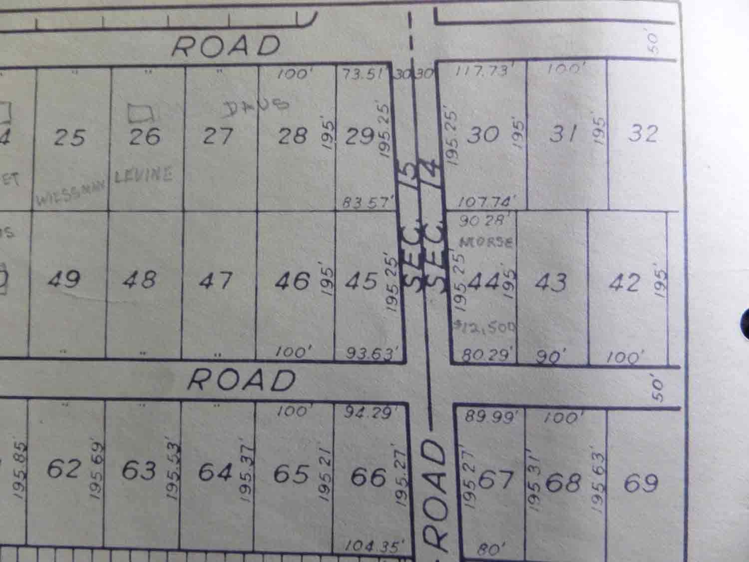 This sheet was updated with a pencil probably in 1947 or 1948. Property owner names, property prices and indications of whether there was a structure on the property were noted