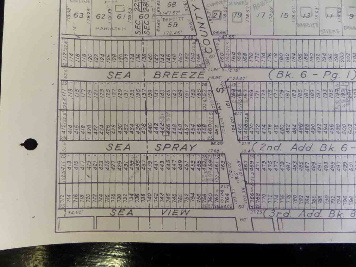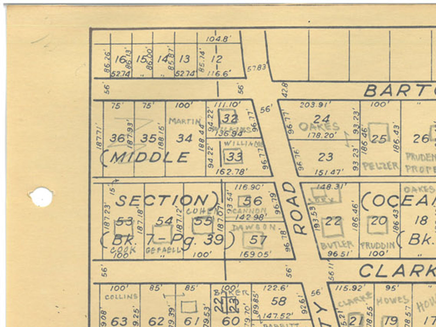This sheet was updated with a pencil probably in 1947 or 1948. Property owner names, property prices and indications of whether there was a structure on the property were noted. I see no property prices on this one