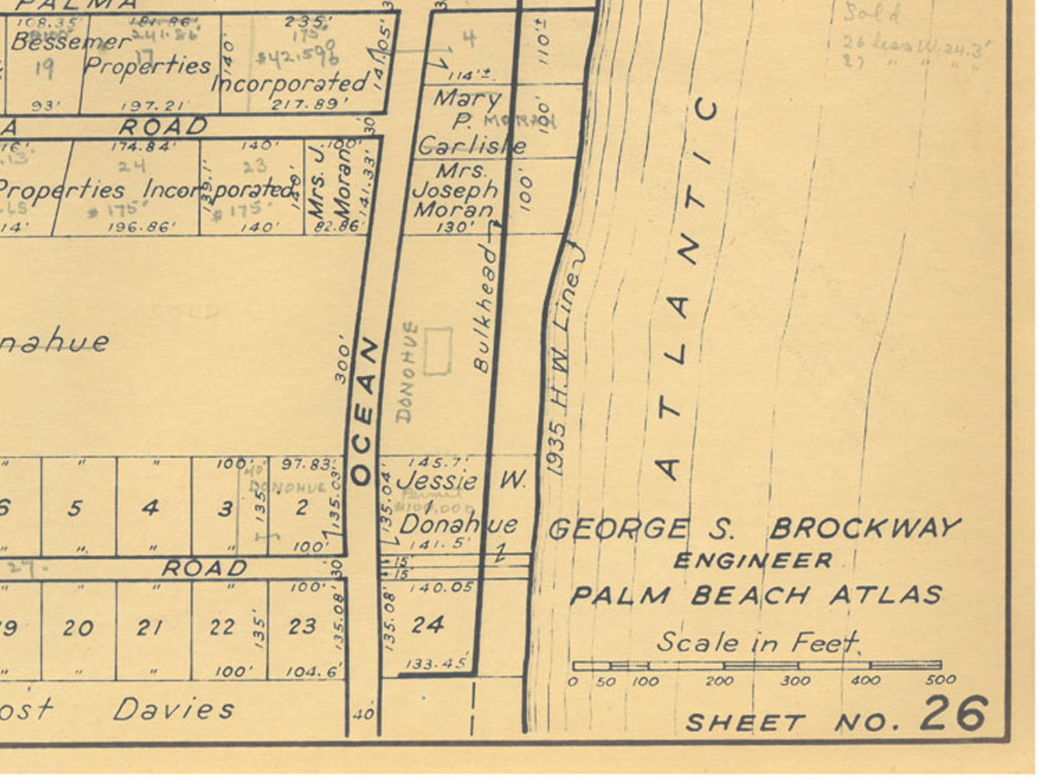 It appears that this sheet was updated with a pencil in May 1948. Property owners names, property prices and indications of whether there was a house on the property were noted