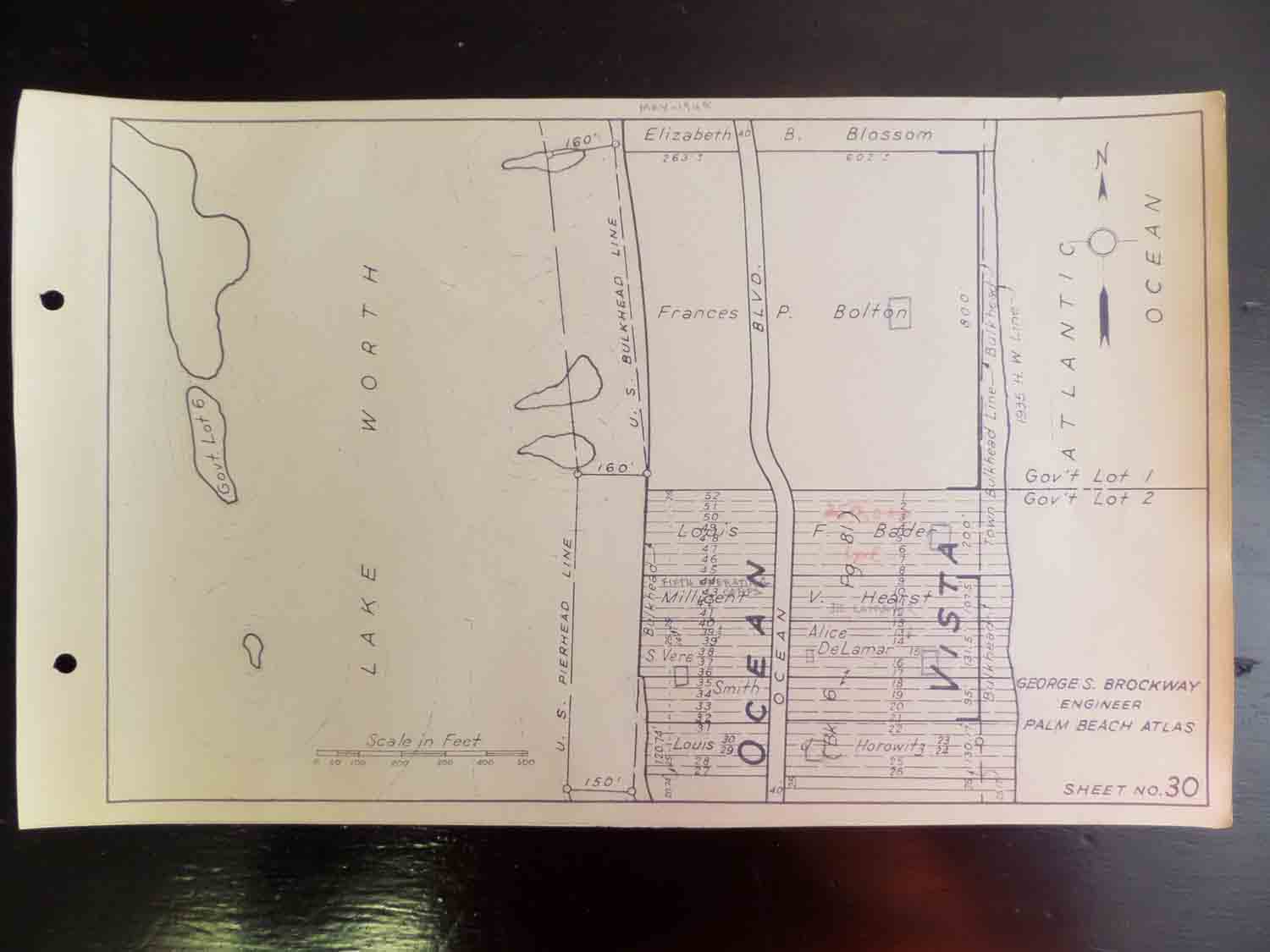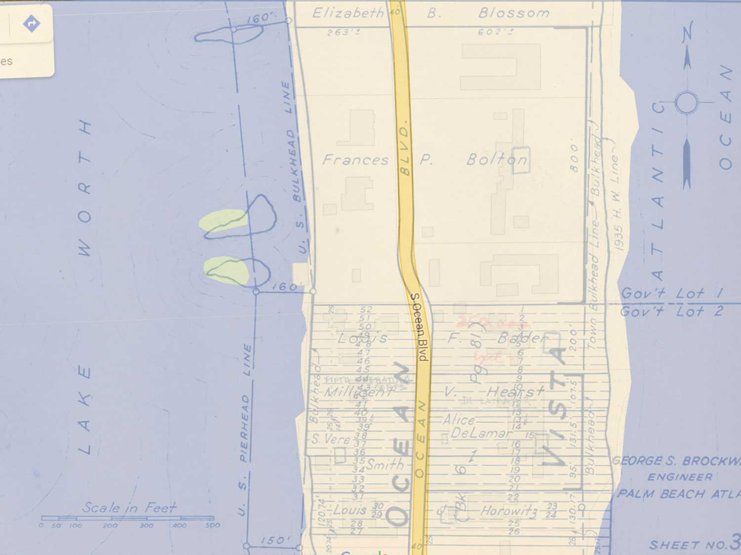 Built around 1920 for Chester and Francis Bolton stands on this property and had an original address of 1300 S. Ocean Blvd. The estate has been subdivided with ~200' oceanfront sections on both the North and South sides and the land West of S. Ocean Blvd. parceled out