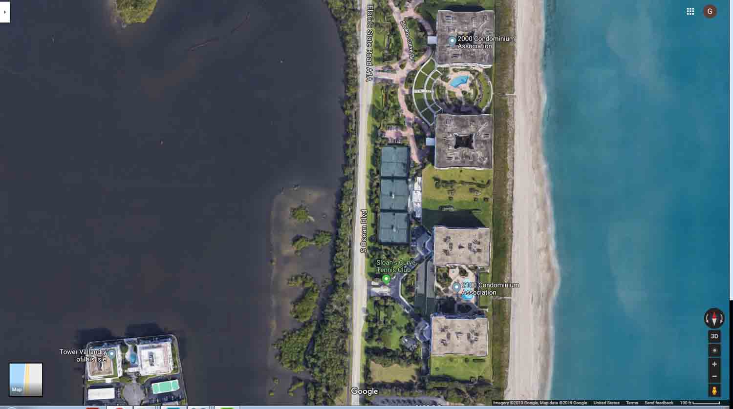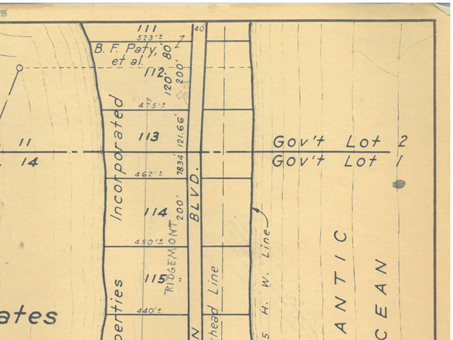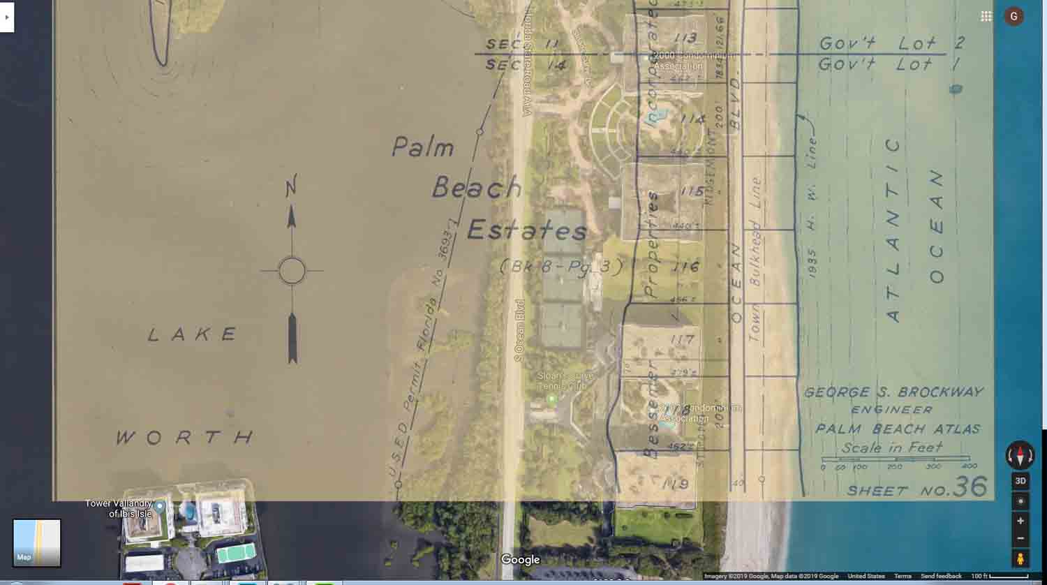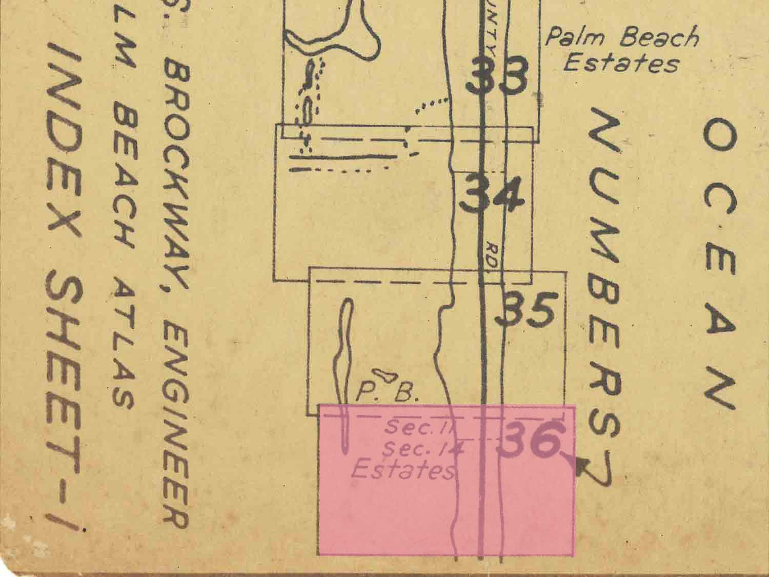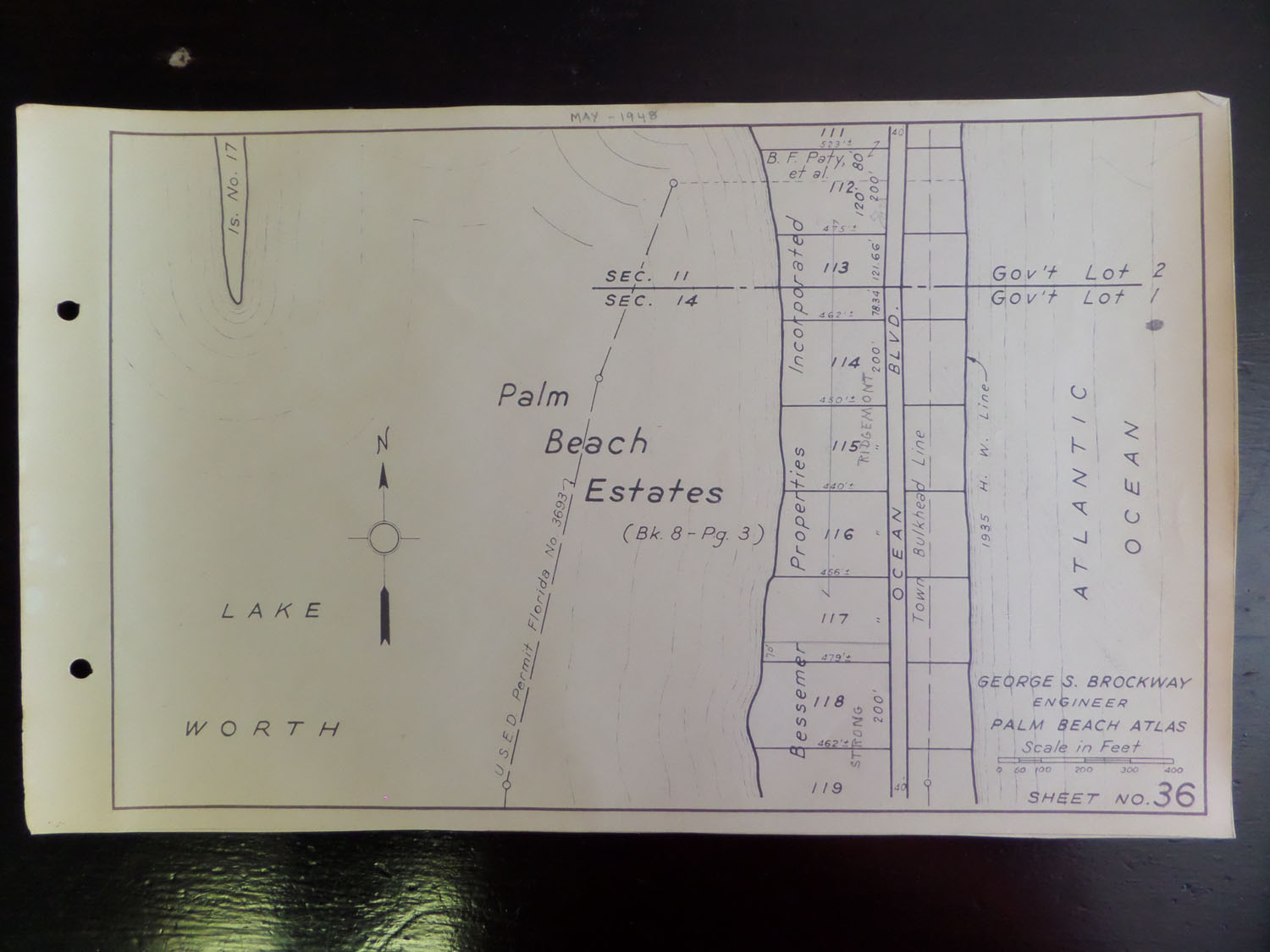 After a hurricane washed out part of Ocean Blvd south of present day Sloan's Curve the Island was filled on the Intracoastal side, Ocean Blvd, now A1A, was routed inland along the Intracoastal side. Sheets 36 to 47 were drawn before that and show Ocean Blvd as it was before - running straight down the top of the dune on the Atlantic side