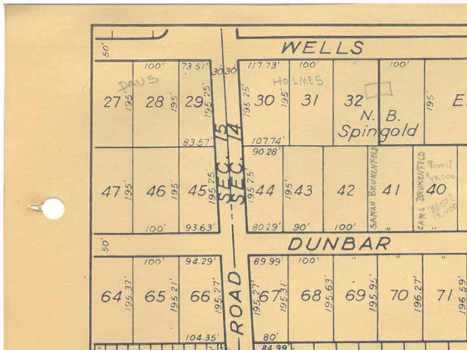 This sheet was updated with a pencil probably in 1947 or 1948. Property owner names, property prices and indications of whether there was a structure on the property were noted