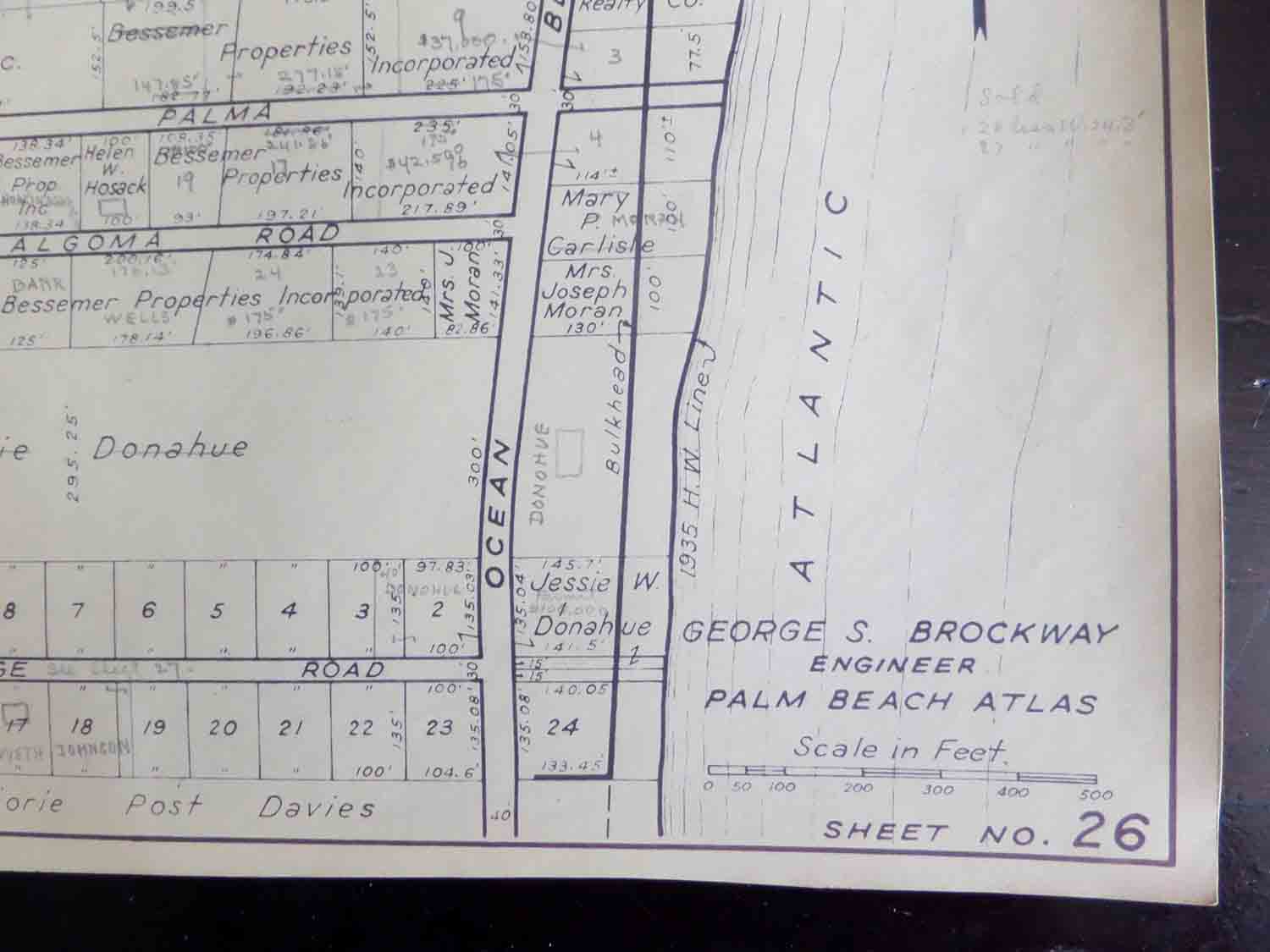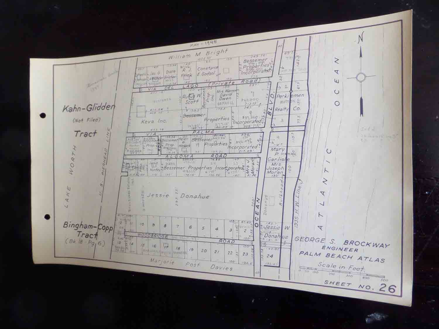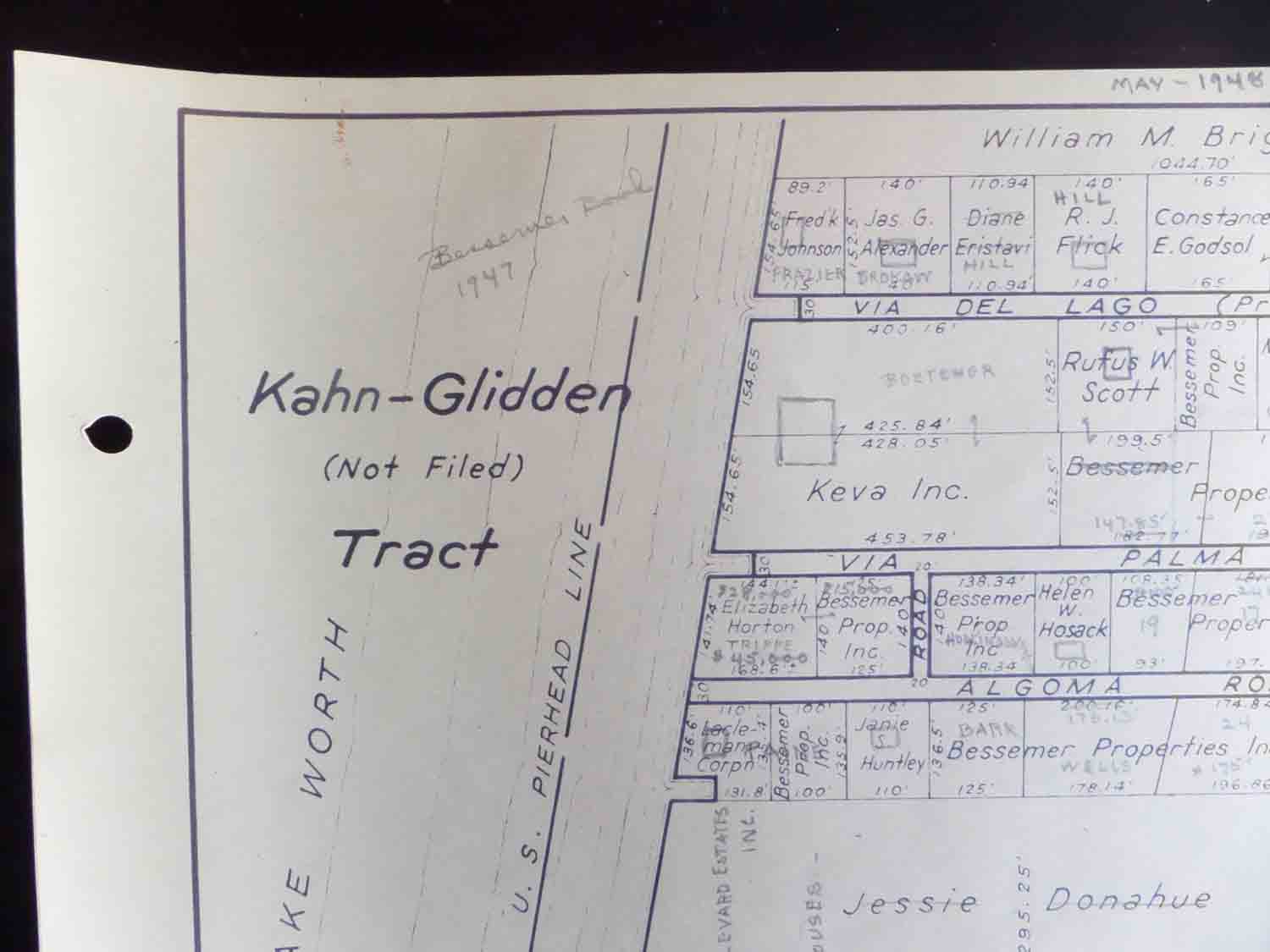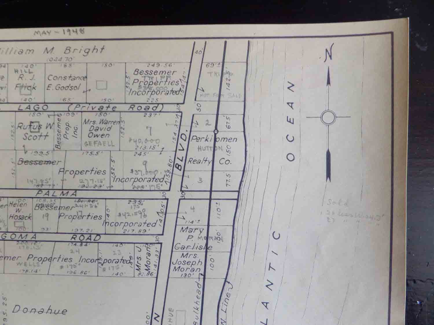 It appears that this sheet was updated with a pencil in May 1948. Property owners names, property prices and indications of whether there was a house on the property were noted