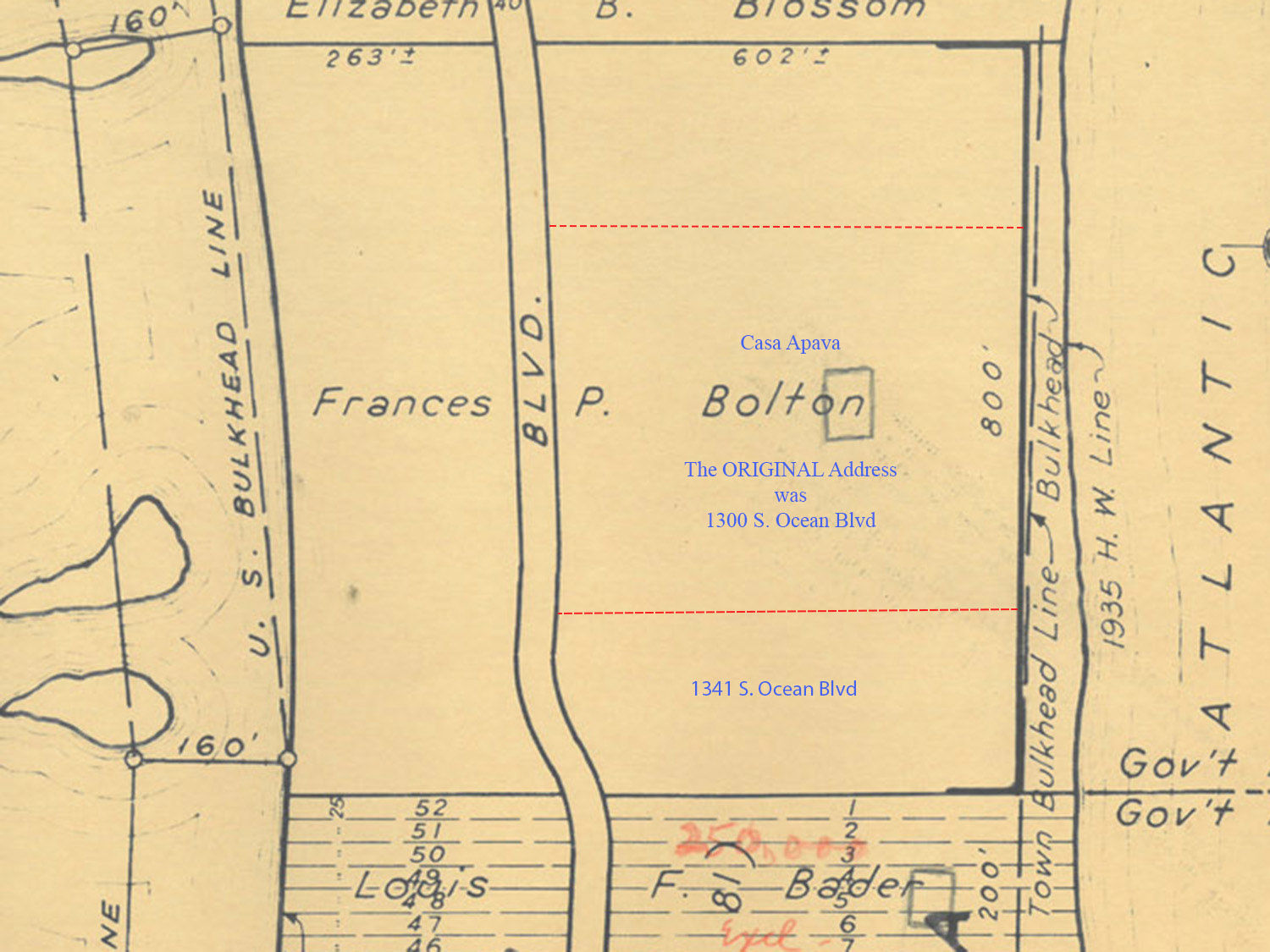 Built around 1920 for Chester and Francis Bolton stands on this property and had an original address of 1300 S. Ocean Blvd. The estate has been subdivided with ~200' oceanfront sections on both the North and South sides and the land West of S. Ocean Blvd. parceled out