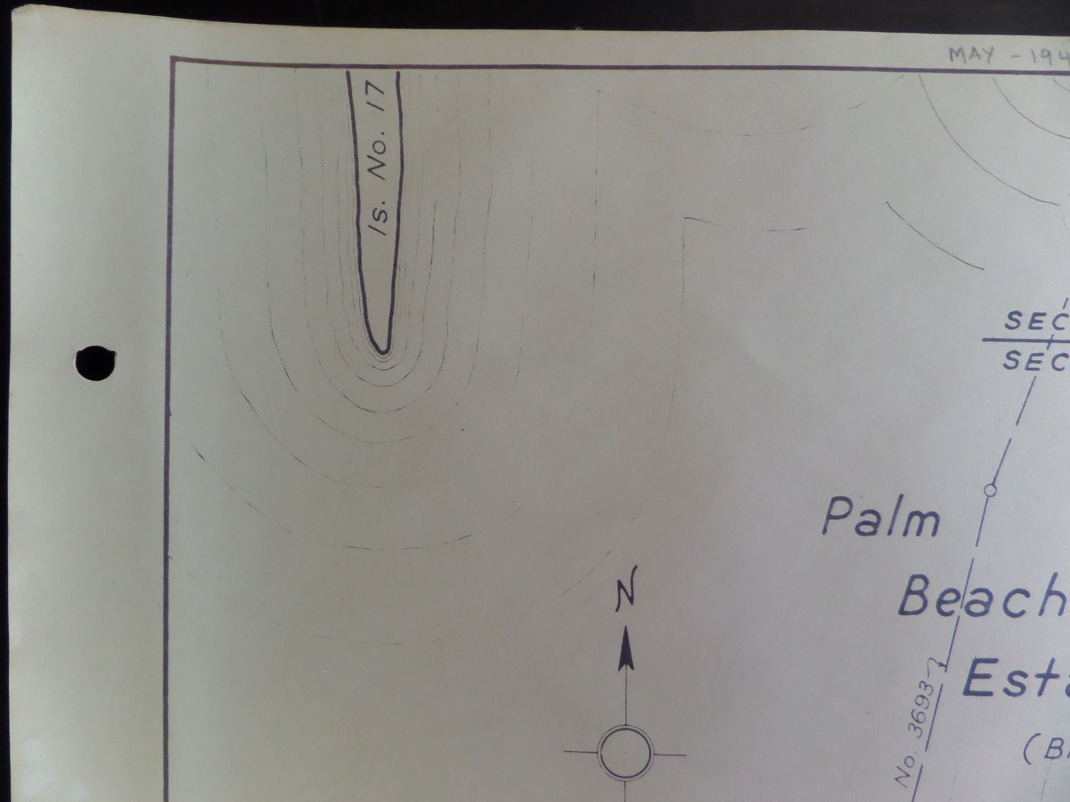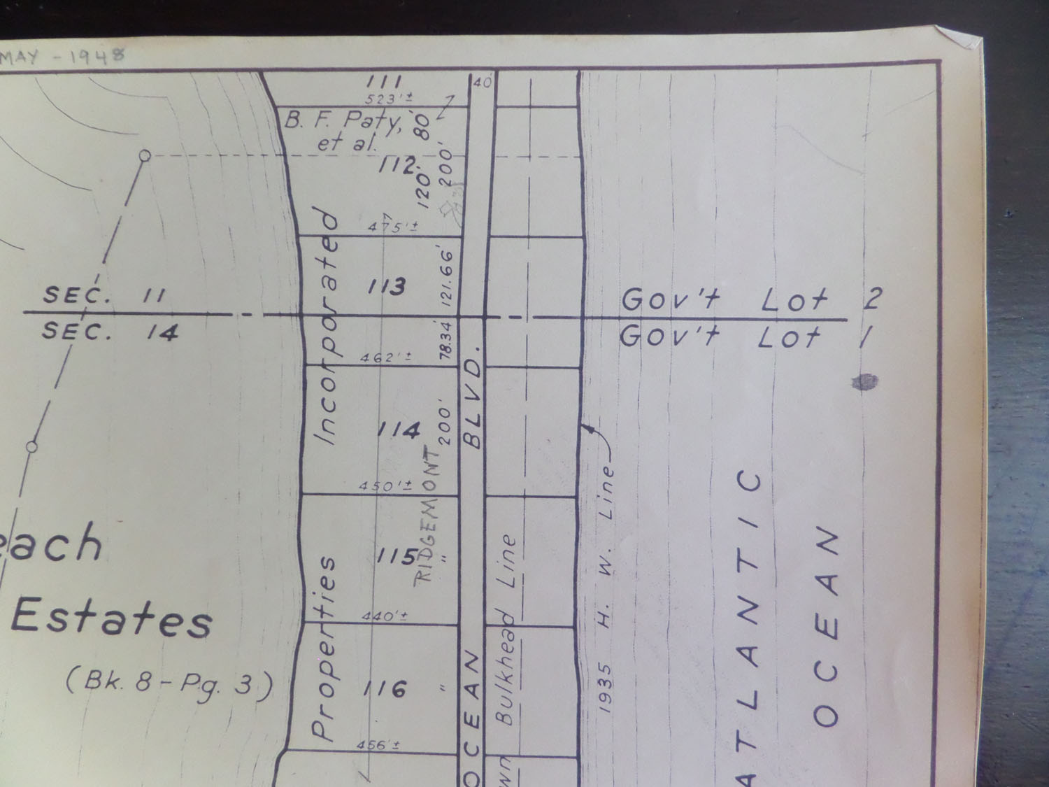 After a hurricane washed out part of Ocean Blvd south of present day Sloan's Curve the Island was filled on the Intracoastal side, Ocean Blvd, now A1A, was routed inland along the Intracoastal side. Sheets 36 to 47 were drawn before that and show Ocean Blvd as it was before - running straight down the top of the dune on the Atlantic side
